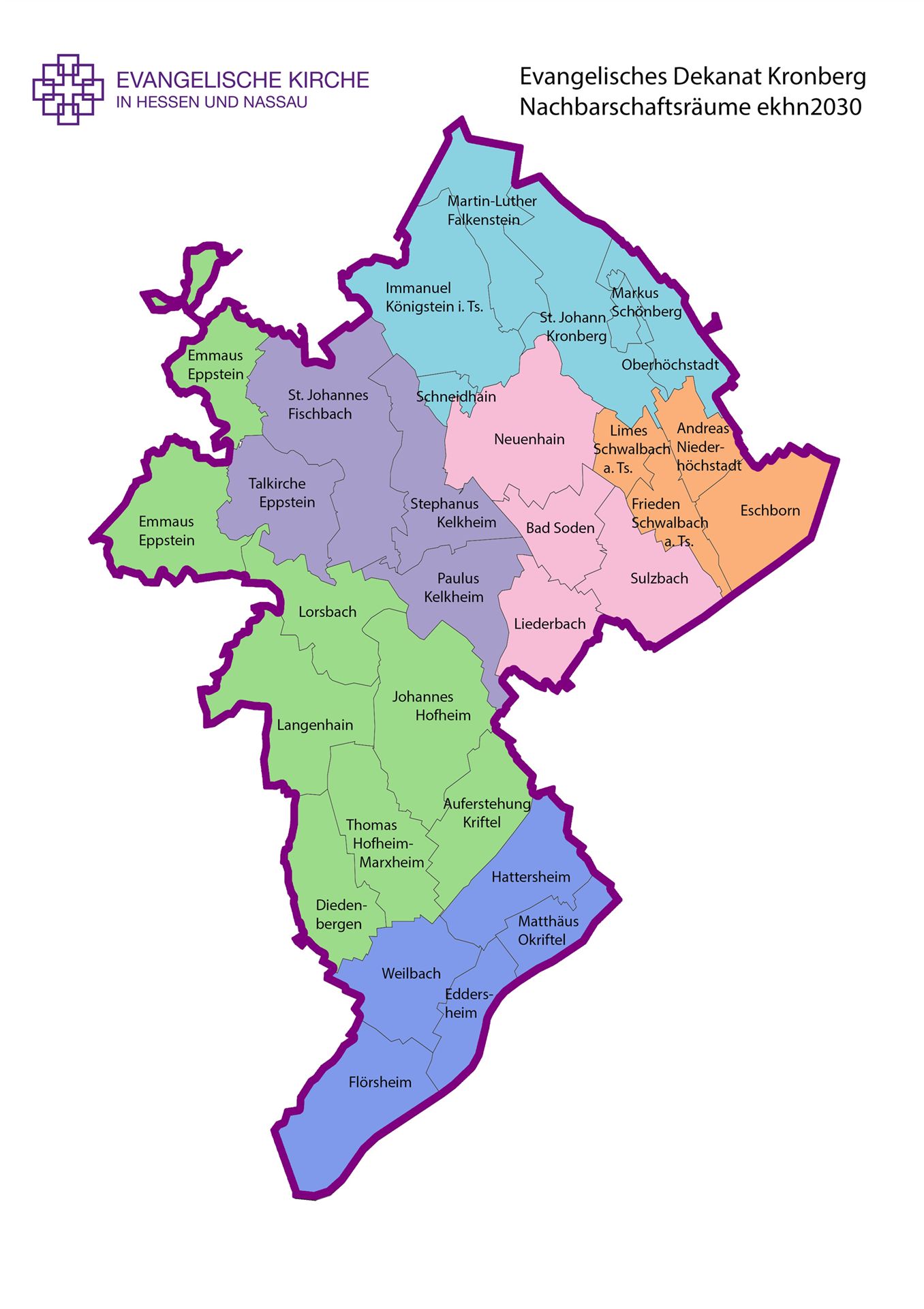 Nach langen und intensiven Beratungen haben sich die 30 Gemeinden im Dekanat in einem Prozess, der im Februar 2022 begann, auf die Bildung von sechs NBR geeinigt. Dabei gab es jedoch gewissen Unmut, da die Landessynode inmitten dieses Prozesses die Mindestgrößen für die NBR angehoben hatte. Dadurch mussten sich einige Gemeinden, darunter auch wir, erneut orientieren. Am Ende wurden sechs NBR festgelegt (siehe Karte), die alle bis zum Stichtag 01.01.2022 jeweils mehr als 7.200 Gemeindeglieder umfassen.