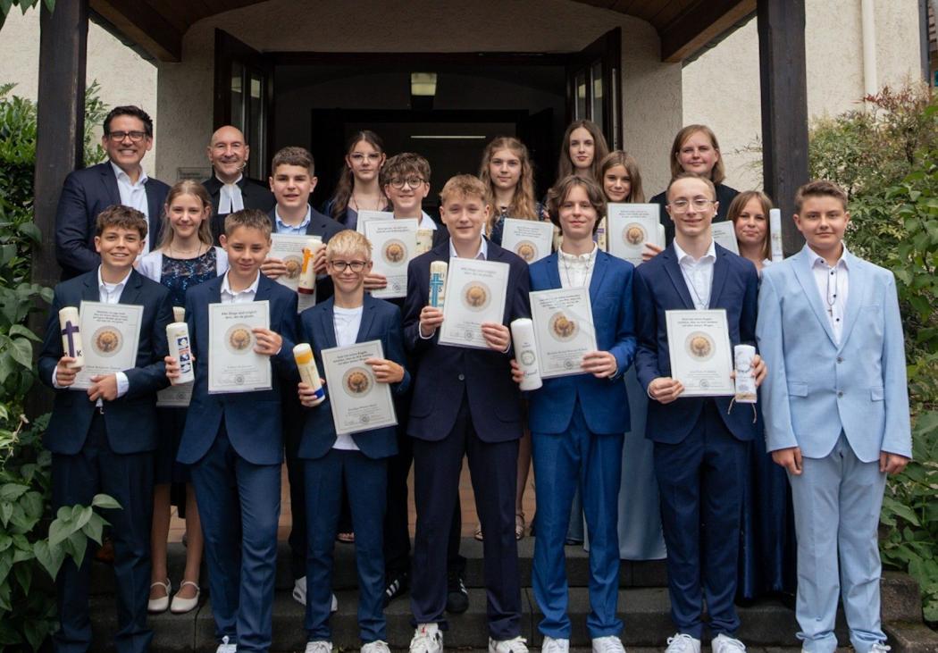 Hinten: Thomas Milkowitsch, Pfr. Rasmus Bertram, Mia Pissors, Johanna Höhn, Lisa Schales und Kristel Neitsov-Mauer, Mitte: Pauline Voß, Nick Pörtner, Florian Schönfeld, Emelly-Sophie Schirrmann und Jana Ina di Dio, vorne: Jakob Benjamin Zdarek, Fabian Kullmann, Emiljan Neef, Luke Richter, Bennet Kühne, Levi Fröhlich und Robin They (Auf dem Bild fehlt Dorian Sadiku)