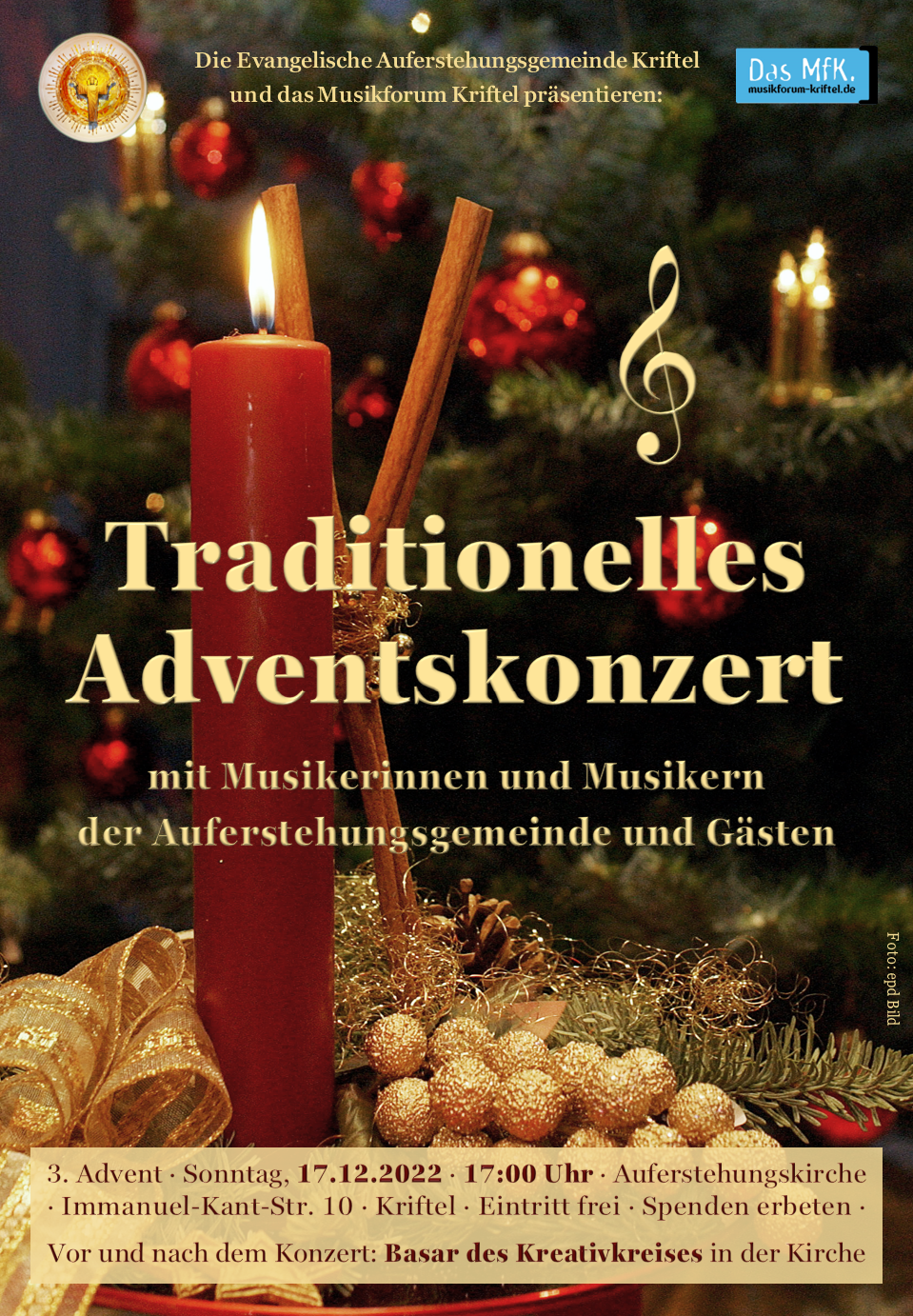 Am dritten Advent, dem 17. Dezember 2023, hat die Evangelische Auferstehungsgemeinde in Zusammenarbeit mit dem Musikforum Kriftel wieder zu ihrem traditionellen Adventskonzert eingeladen. "Traditionell" war auch das Motto des Programms, das Kristel Neitsov-Mauer in bewährter Weise zusammengestellt hatte.