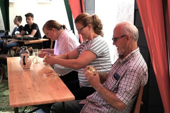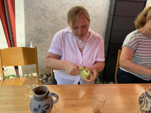Mit der Begrüßung durch Thomas Milkowitsch begann das Nachmittagsprogramm. Er wies auf den Tag der Schöpfung hin und freute sich, dass „wir alle genießen, teilen und feiern dürfen“. Herzlich dankte er dem Festausschuss, dem Technik-Team (Levi und Levin) sowie den Konfirmanden und allen, die sich an der Organisation des Festes beteiligt hatten.Beim Unterhaltungsprogramm wurde viel geboten. Für eine Podiumsdiskussion begrüßte die Moderatorin (Kristel Neitsov-Mauer) als Experten eine Ärztin (Christa Spinczyk), einen Kirchenvertreter (Thomas Milko-witsch), einen Gelehrten (Charlotte Weißenberger) und einen Poeten (Peter Schilling). Von ihnen konnten die Gäste allerhand Neues zum malus domestica (Hausapfel) erfahren.Nach einem Lied für alle Gemeindemitglieder schloss sich die Jugend-gruppe (siehe S. 16) mit einer Pantomime an. Sie stellten verschiedene Begriffe dar, die das Publikum erraten musste. Wilhelm Tell, Adam und Eva, Newton und Schneewittchen waren dank der geschickten Darstellung schnell erraten. Beim Apfelquiz wurden die Gäste tischweise in Teams aufgeteilt. Für diejenigen, die aufmerksam das Geschehen verfolgt hatten, waren die Fragen nicht sehr schwer zu beantworten und so gab es mehrere Gruppen, die richtig lagen. Der Preis (Apfelkekse, Apfeltee, Cidre…) wurde ausgelost. Das Bembelstemmen war definitiv zu leicht. Von den vier Kandidaten machte keiner schlapp. Alle konnten den mit einem Liter Wasser gefüllten Bembel für eine geraume Zeit in der Waagerechten halten und das Turnier endete unentschieden. Beim Quiz „um die Ecke denken“ musste man Begriffe erraten, die alle mit dem Apfel zu tun haben: Augapfel, Reichsapfel, Pferdeapfel, Zankapfel, Adamsapfel und Granatapfel. Bei der Erzeugung einer langen Apfelschalen-Schlange durch das Schälen eines Apfels konnte keiner die Leistung von Kristel Neitsov-Mauer toppen, sehr konzentriert schälte sie bis zum Sieg.
