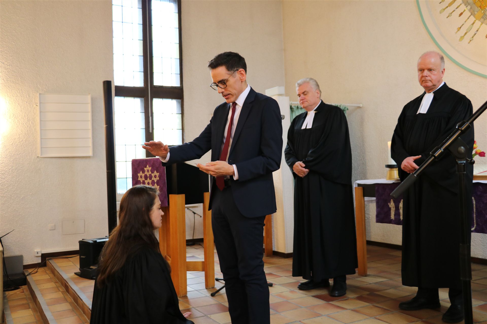 Berührend waren die Worte, die Propst Oliver Albrecht bei der Ordination an Melanie Khalil richtete. Zur inneren Stärkung hatte er für sie den Vers 105 aus Psalm 119 ausgesucht. „Dein Wort ist meines Fußes Leuchte und ein Licht auf meinem Wege“, heißt es dort.