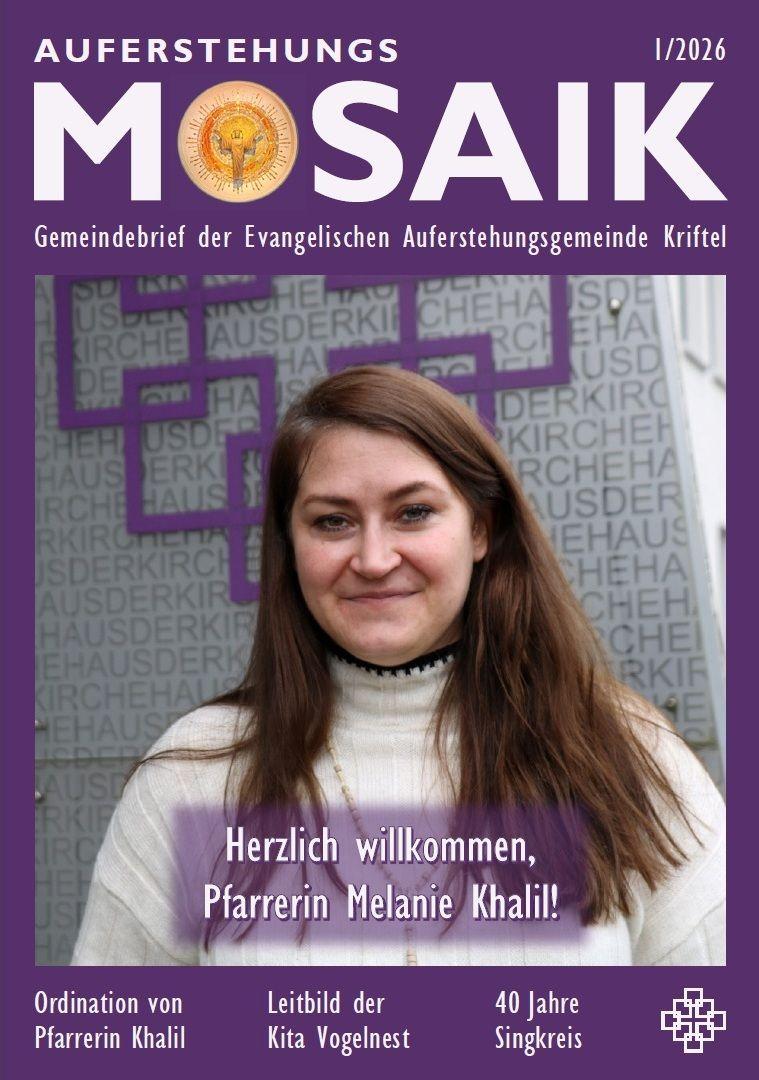 Die Frühjahrsausgabe unseres Gemeindebriefes "Auferstehungs-Mosaik" ist erschienen und wird in den nächsten Tagen an alle evangelischen Haushalte in Kriftel verteilt. Sollte Ihnen kein Exemplar zugestellt worden sein, wenden Sie sich bitte an unser Gemeindebüro.