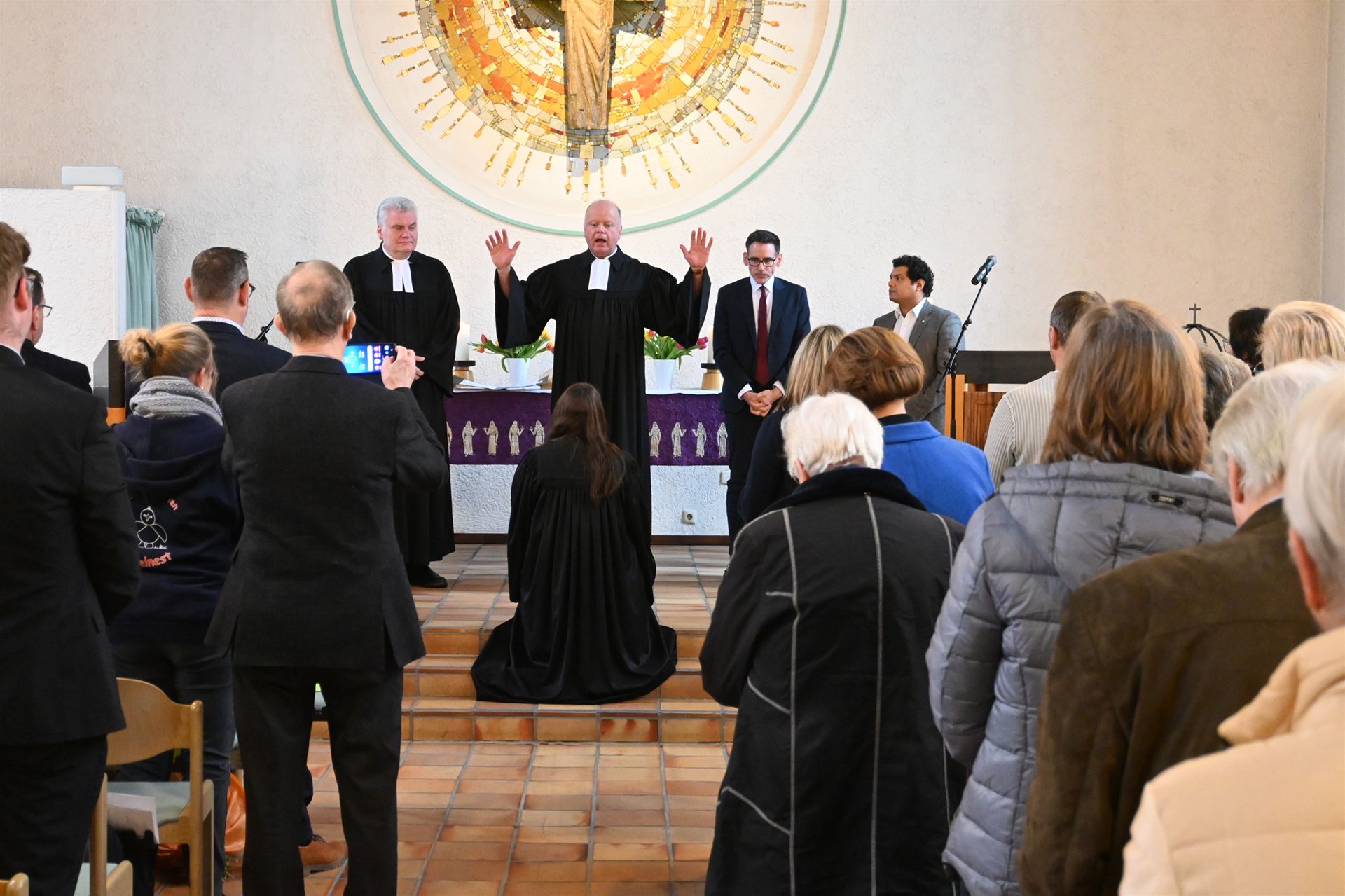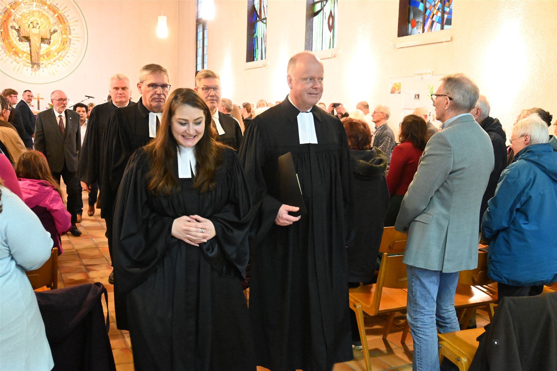 Feierlich war der Einzug von Propst Oliver Albrecht, Dekan Dr. Martin Fedler-Raupp, Pfarrer Reinhardt Schellenberg, Pfarrer Andreas Hannemann, Pfarrerin Melanie Khalil, Samuel Khalil und Mitgliedern des Kirchenvorstands: Viele schwarze Roben, erwartungsvolle Gesichter bei den Gottesdienstbesuchern und dazu die Musik „Trumpet Tune“ von Henry Purcell.